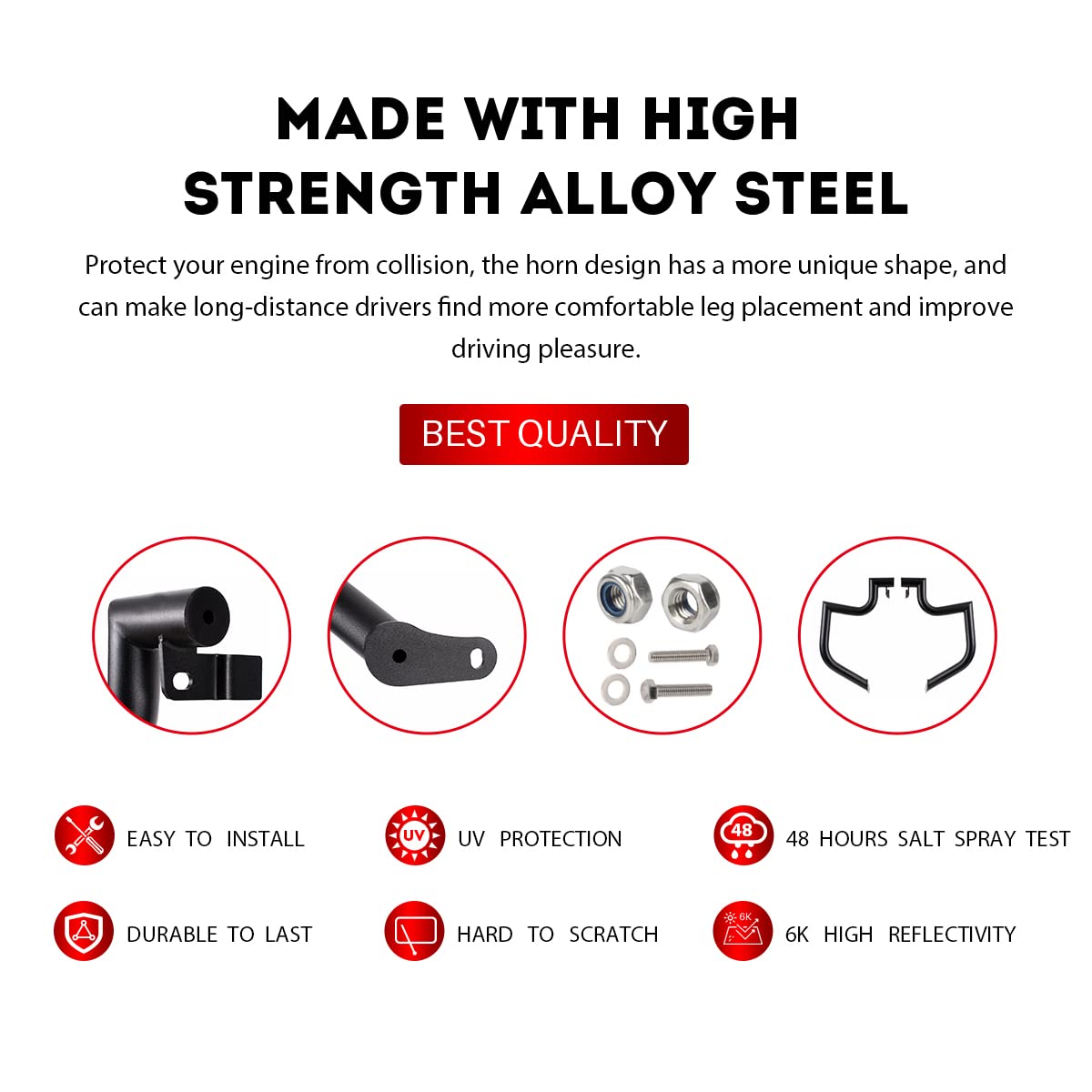 - ▶FEATURES- The engine guard highway crash bar material is a 1.5″ steel tube that is thicker than most sellers. All screws are 304 stainless steel.