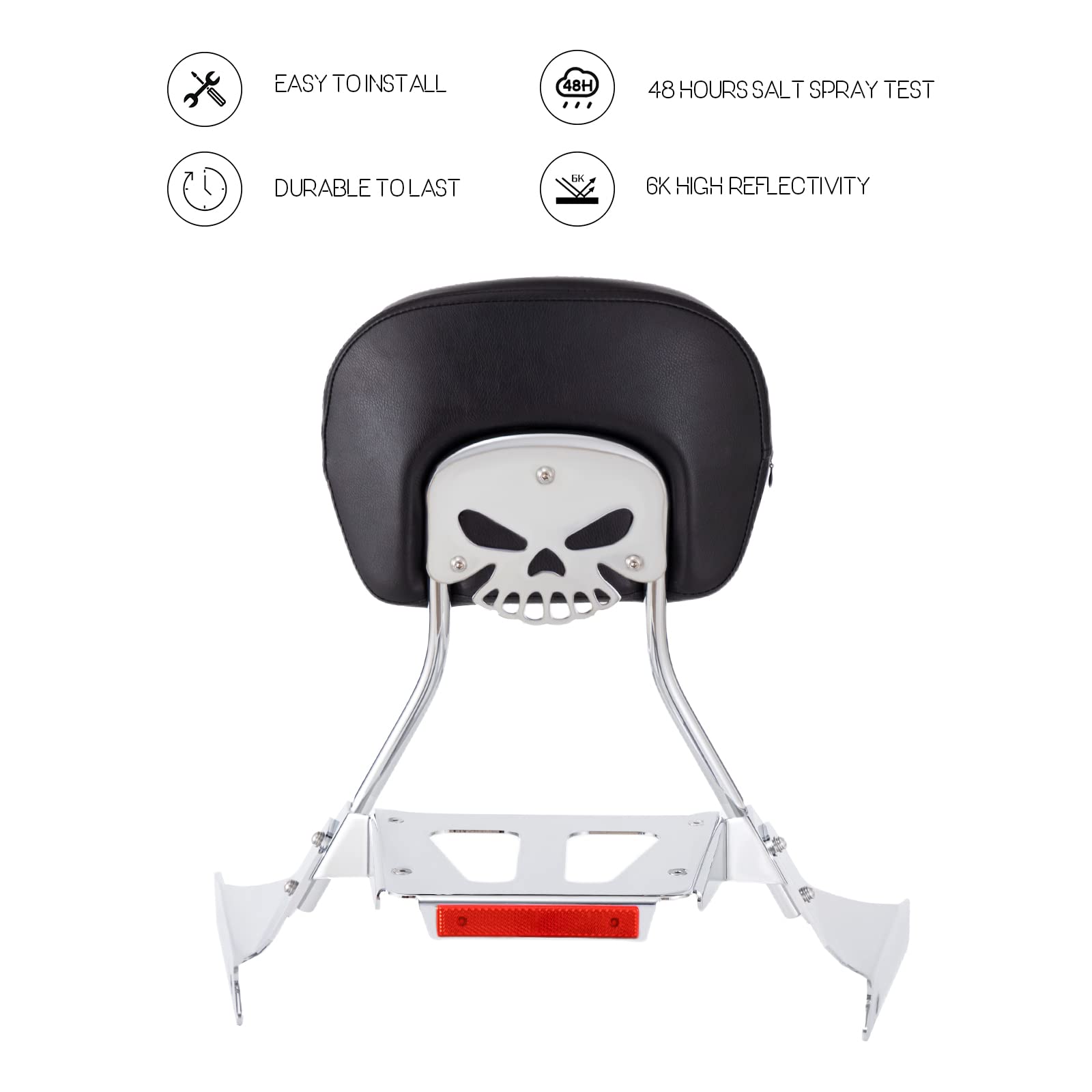 - ➤FEATURES -The backrest provides great support for rear passengers and improves riding comfort on a long touring. The chrome luggage with reflective strips allows you to drive safely in the dark. The Sissy bar material is steel that thicker than most sellers and it passes a 48-hour salt spray test. All screws are 304 stainless steel.