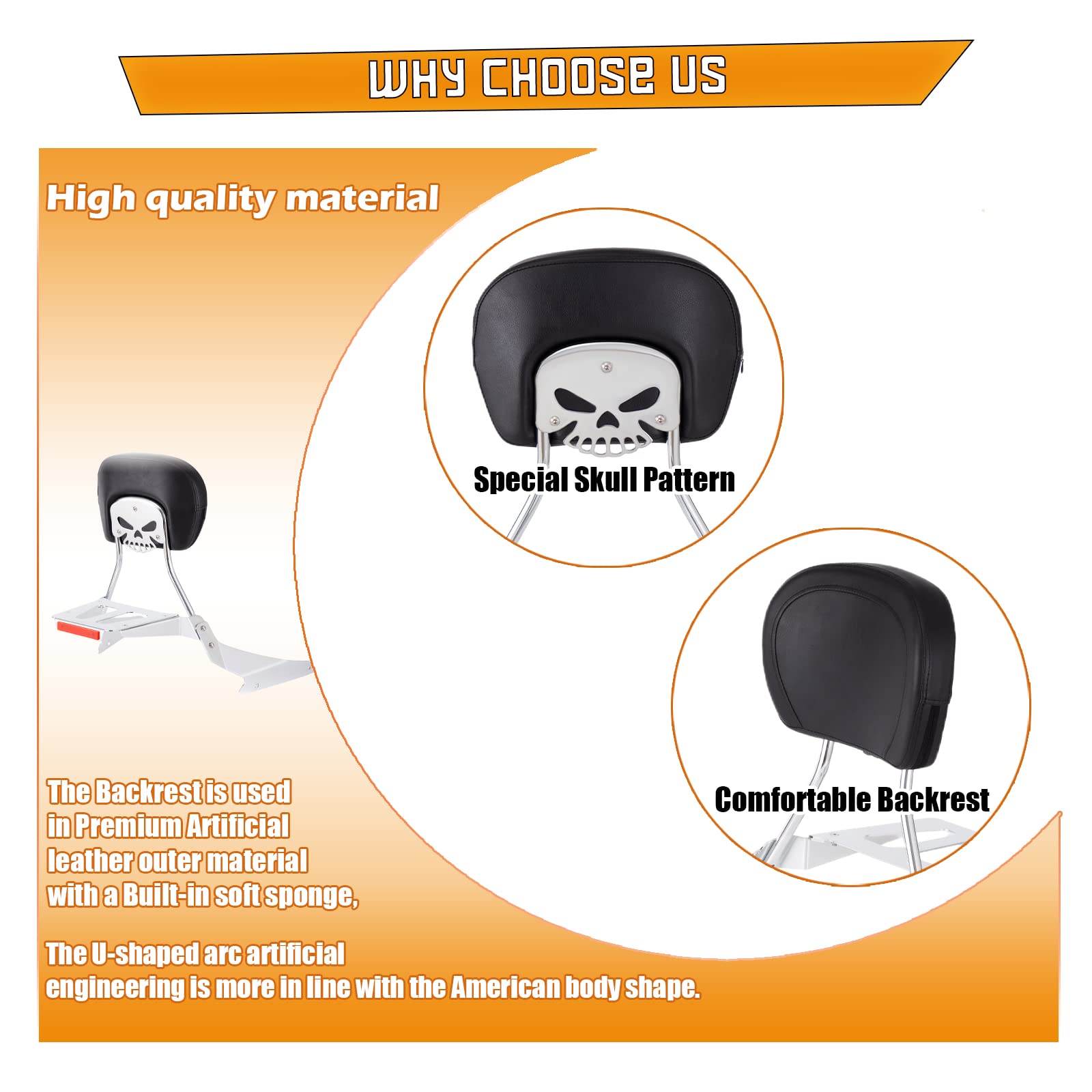 - ➤DESIGN - We designed the skull-shaped pattern of the backrest connecting plate for the Sissy bar to make your sissy bar more personalized.