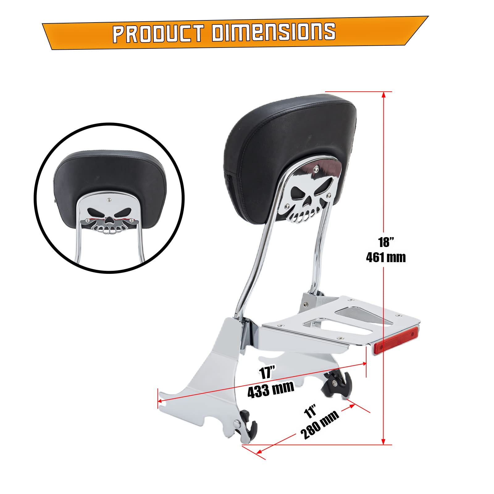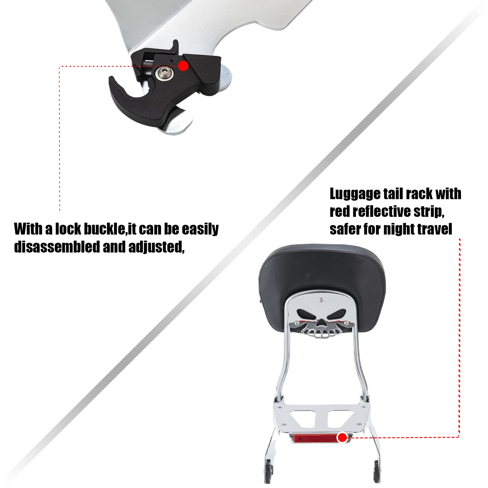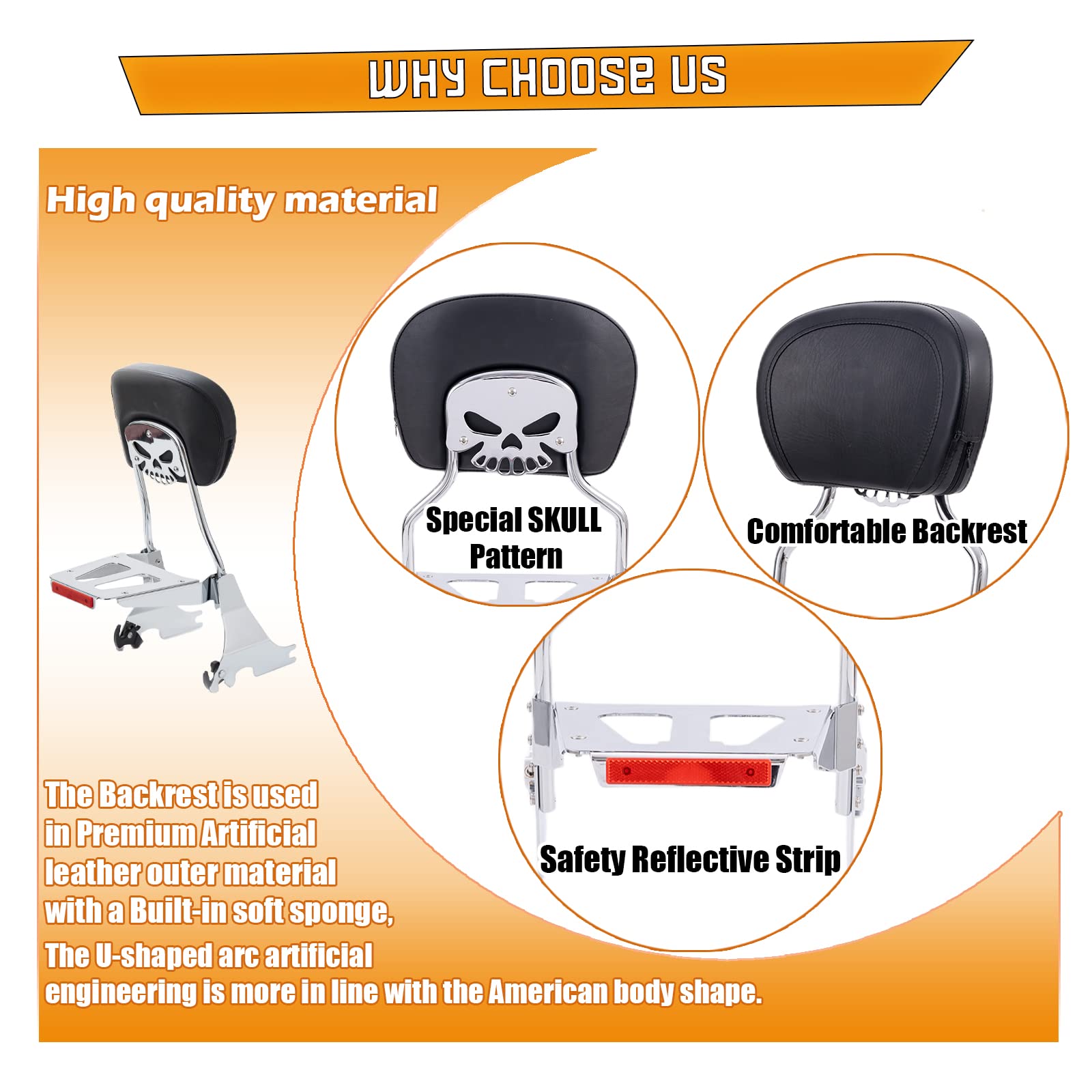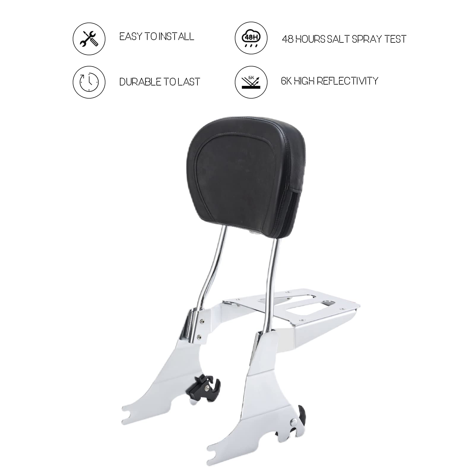- ➤FEATURES -The backrest provides great support for rear passengers and improves riding comfort on a long touring. The chrome luggage with reflective strips allows you to drive safely in the dark. The Sissy bar material is steel that thicker than most sellers and it passes a 48-hour salt spray test. All screws are 304 stainless steel.