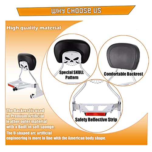 - ➤FEATURES -The backrest provides great support for rear passengers and improves riding comfort on a long touring. The chrome luggage with reflective strips allows you to drive safely in the dark. The Sissy bar material is steel that thicker than most sellers and it passes a 48-hour salt spray test. All screws are 304 stainless steel.