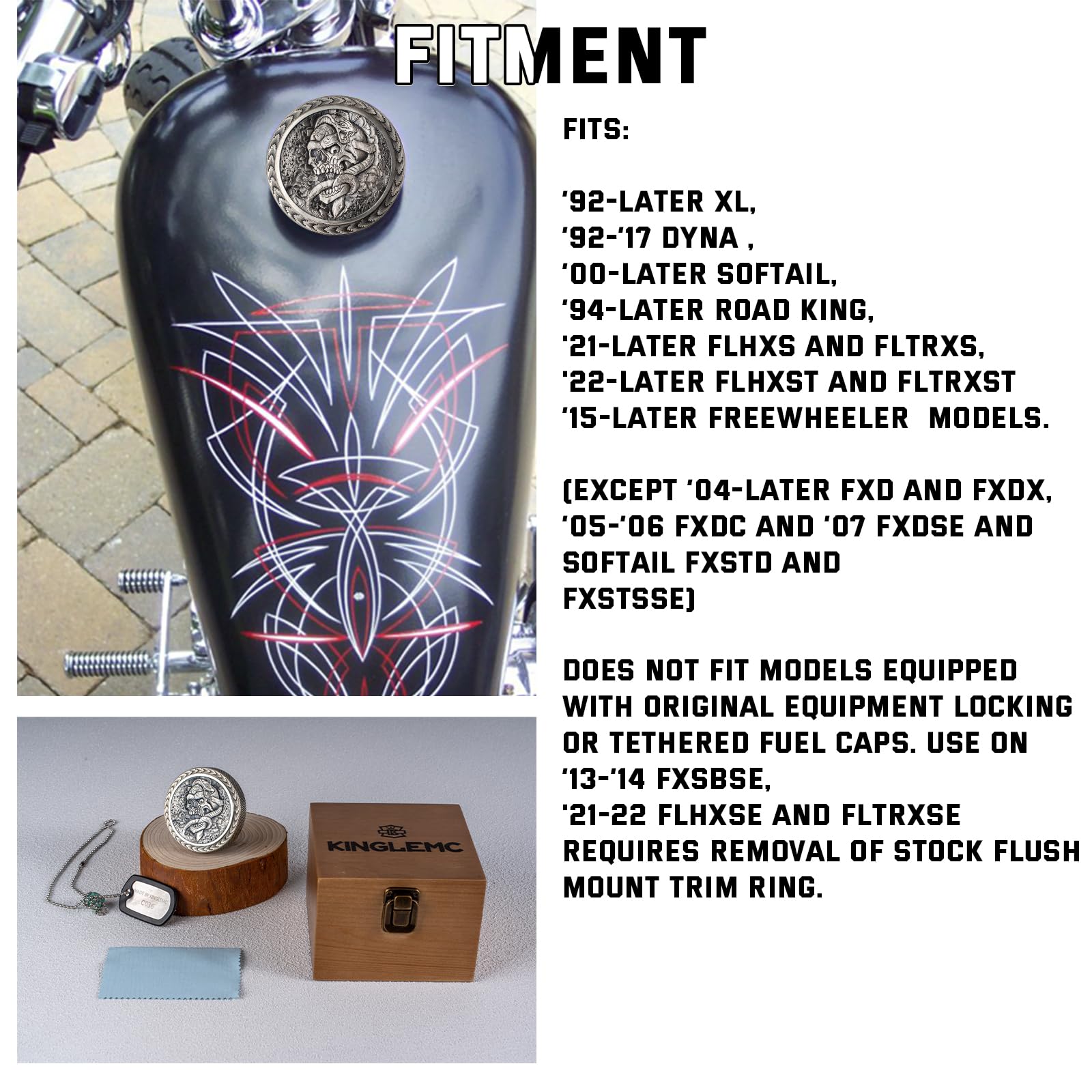 - ★FITMENT -Fits ’92-later XL, ’92-’17 Dyna (except ’04-later FXD and FXDX, ’05-’06 FXDC and ’07 FXDSE), ’00-later Softail, (except FXSTD and FXSTSSE) ’94-later Road King, '21-later FLHXS and FLTRXS, '22-later FLHXST and FLTRXST and ’15-later Freewheeler models. Does not fit models equipped with Original Equipment locking or tethered fuel caps. Use on ’13-’14 FXSBSE, '21-22 FLHXSE and FLTRXSE requires removal of stock flush mount trim ring.